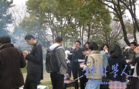正午時分,同學們又回到賞花的大本營-----大濠公園櫻花樹下!皟(yōu)しい”的學友會負責人員已經(jīng)為大家準備好了烤肉用的器具以及各種飲料。大家自覺地分成三、五人一組,圍著燒烤架邊聊天邊開始品嘗自己動手制作的美食。