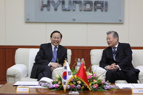 張大使一行首先參觀了現(xiàn)代汽車牙山工廠包括總裝車間在內(nèi)的幾個主要車間。高度自動化的生產(chǎn)、井然有序的管理,引起了參觀者的濃厚興趣。張大使一邊觀看,一邊詳細了解工廠的生產(chǎn)、技術、經(jīng)營等情況,并對工廠的經(jīng)營業(yè)績予以高度評價,對現(xiàn)代汽車集團同中國的合作表示贊賞。現(xiàn)代汽車負責人歡迎張大使一行,表示現(xiàn)代汽車集團同中國開展著廣泛的交流與合作,北京現(xiàn)代汽車已經(jīng)成為中韓經(jīng)貿(mào)合作的成功范例,F(xiàn)代汽車作為年產(chǎn)430萬輛汽車的全球性企業(yè),將為中韓友好關系的發(fā)展做出積極努力。他們還表示,中韓建交以來,兩國交流日益活躍,在韓國留學的中國學生人數(shù)日益增多,此次邀請留學生現(xiàn)場參觀,也是希望他們努力學習,為中韓友好多做貢獻。