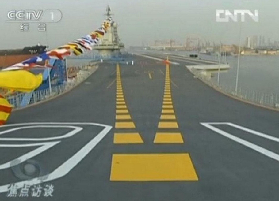 中國首艘航母滑躍甲板。(央視截圖)