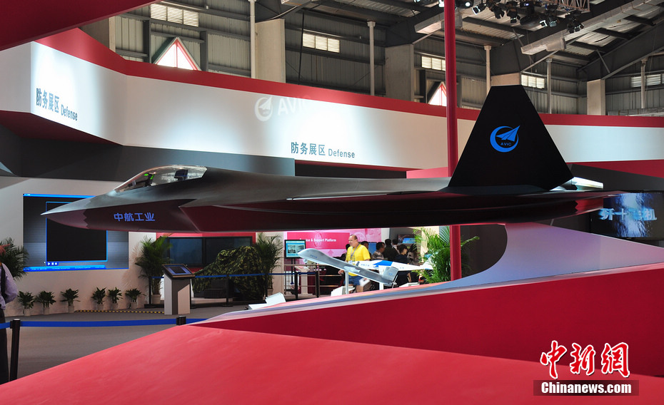 記者在珠海航展現(xiàn)場發(fā)現(xiàn),中國工業(yè)推出一款“先進戰(zhàn)斗機概念”1:4模型,從外形上看,與前不久成功試飛的殲31相似。這也是國產(chǎn)四代機首次在珠海航展上亮相,標(biāo)志著珠海航展已進入四代機時代。陳海峰 攝