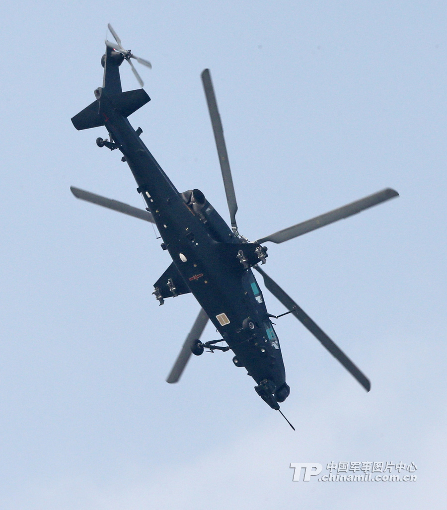 11月13日,我國(guó)自主研制生產(chǎn)的武直-10武裝直升機(jī)亮相在珠海舉行的第九屆中國(guó)國(guó)際航空航天博覽會(huì),在飛行表演中展示了這款直升機(jī)的優(yōu)良性能。圖為武直-10對(duì)地垂直攻擊。記者喬天富 攝