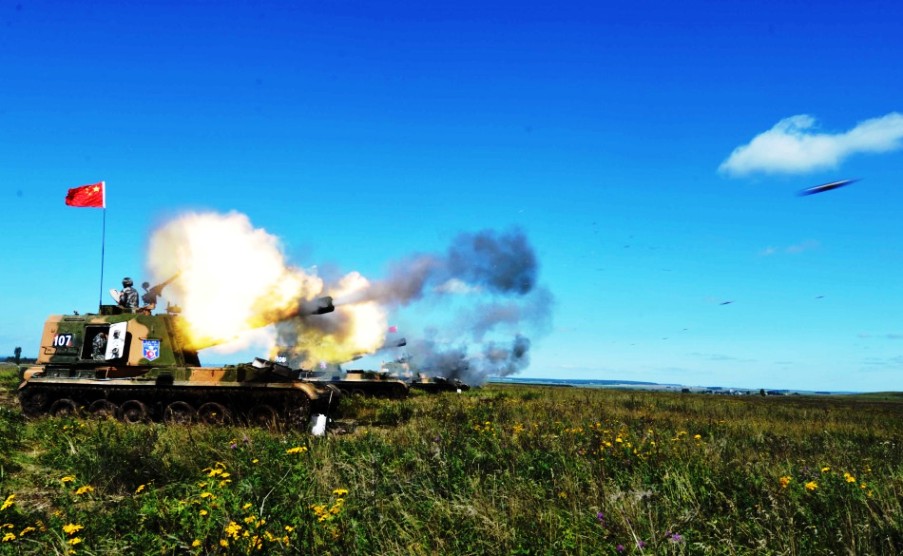 8月12日12時(北京時間12日下午2點(diǎn)),“和平使命-2013”中俄聯(lián)合反恐軍事演習(xí)在俄切巴爾庫爾合同訓(xùn)練場進(jìn)行實(shí)兵實(shí)彈協(xié)同訓(xùn)練,中俄雙方出動所有參演兵力,對聯(lián)合封控、分區(qū)清剿、火力突擊等內(nèi)容進(jìn)行訓(xùn)練,時間大約50多分鐘。圖為中方炮火實(shí)施遠(yuǎn)程火力攔阻。新華社發(fā) 譚長俊 攝