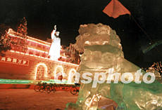 在東北寒冷地帶的吉林省會(huì)長(zhǎng)春市中心,為歡慶新年準(zhǔn)備好一座冰燈天安門,潔白的冰雕獅子與紅紅火火的城樓毛澤東塑像相映益彰。作者:賈國(guó)榮