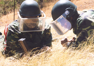 2002年11月1日,專家組按計(jì)劃轉(zhuǎn)場(chǎng)到厄西南部的塞壩村和阿瑞扎,指導(dǎo)厄受訓(xùn)學(xué)員對(duì)這兩片山地雷場(chǎng)進(jìn)行現(xiàn)場(chǎng)掃雷。