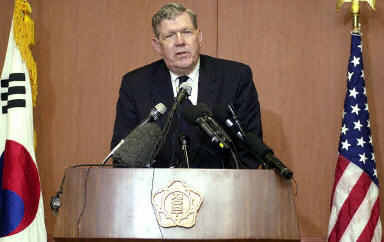 據(jù)“中央社”報道,凱利以美國布什總統(tǒng)的特使身份訪問漢城,在會見韓國總統(tǒng)當選人盧武鉉之后,在漢城外交部舉行新聞發(fā)布會。