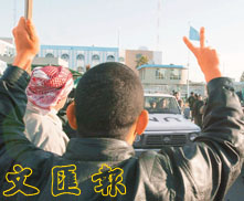 數(shù)百名伊拉克記者聚集在運(yùn)河酒店門外,在一九九一年海灣戰(zhàn)爭周年舉行抗議活動(dòng)。于海灣戰(zhàn)爭中,伊拉克部隊(duì)占領(lǐng)了科威特七個(gè)月后,被以美國為首的盟軍驅(qū)逐出科威特。