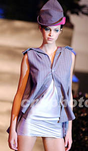在香港舉辦的“香港青年時(shí)裝設(shè)計(jì)家創(chuàng)作表演賽2003”上,模特展示青年時(shí)裝設(shè)計(jì)師楊展的獲獎(jiǎng)作品。洪少葵 攝