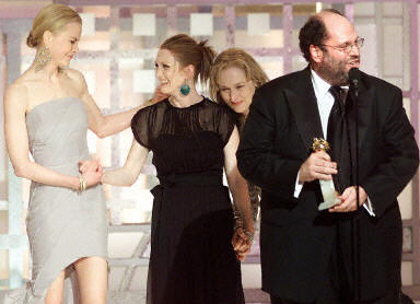 在競(jìng)爭(zhēng)激烈的劇情類最佳影片項(xiàng)目中,與《時(shí)時(shí)刻刻》一同入圍的還有《紐約黑幫》、《心的方向》、《魔戒二部曲:雙城奇謀》以及《戰(zhàn)地琴人》。其中雖然有掀起全球票房賣(mài)座旋風(fēng)的《魔戒二部曲》,最后還是由《時(shí)時(shí)刻刻》勝出。