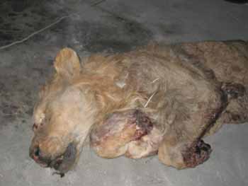 為了配合公安機(jī)關(guān)偵查,李滿堂將已經(jīng)包裹好的獅子尸體重新打開,從獅子的表情可以看出死時很痛苦,李滿堂說,大約在最近幾天,他便發(fā)現(xiàn)籠中的兩頭獅子有些不對勁,整日無精打采,不愛吃食。開始以為獅子患了感冒,給獅子吃了些消炎藥,但隨后兩天獅子仍然不見好而且厭食情況一天比一天嚴(yán)重,并開始出現(xiàn)嘔吐癥狀,隨后公園工作人員將嘔吐物送至丹東市動物檢疫站化驗(yàn)。