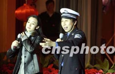 著名相聲演員馮鞏,二十一日一身警裝在北京為公安警員表演相聲,向他們致以新春佳節(jié)的問候。作者:任海霞