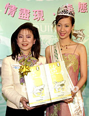 「2003年度國際華裔小姐競選」獲獎佳麗1月26日在香港出席贊助商頒獎儀式,應(yīng)屆國際華裔小姐冠軍陳泳錦接受贊助商頒贈禮品。