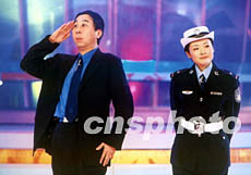中國相聲演員馮鞏(左)與電視主持人周濤,在春節(jié)聯(lián)歡晚會中合作表演相聲《馬路情歌》。作者:王新
