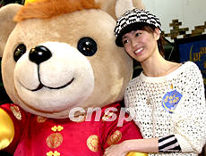 梁詠琪更顯可愛。歌星梁詠琪1月29日在香港出席“親親孩子親親書”啟播儀式,梁詠琪依在身穿唐裝的熊公仔身旁更顯可愛。中新社傳真 鄧慶樂 攝
