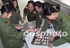 三十日,駐閩某部文藝連營房處處張燈結(jié)彩,喜迎羊年新春一派春意盎然的景象。慰問演出的女兵在連隊(duì)包起了年夜餃子。作者:劉可耕