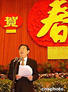 中共中央、國務(wù)院今天上午在人民大會堂舉行春節(jié)團拜會。江澤民、胡錦濤等多位領(lǐng)導(dǎo)人同北京各界人士四千五百多人歡聚一堂,辭舊迎新,共慶中國人民的傳統(tǒng)節(jié)日。朱镕基在團拜會上講話。