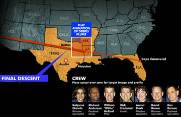 圖:哥倫比亞號失事地點(diǎn)和宇航員示意圖