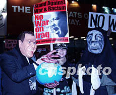 當(dāng)?shù)貢r間二月五日,在鮑威爾向聯(lián)合國提交伊拉克擁有大規(guī)模殺傷性武器新證據(jù)的同時,數(shù)百人在紐約時代廣場集會,反對美國對伊拉克開戰(zhàn)。傍晚時,越來越多下班的紐約人自動加入,集會遂演變?yōu)檠刂氖中羞M(jìn)的反戰(zhàn)示威游行。圖為帶著布什面具的示威者。作者:龔文謨