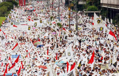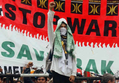 9日在印尼雅加達(dá)爆發(fā)大規(guī)模反美反戰(zhàn)示威,超過5000名穆斯林走上街頭,在美國大使館外抗議美國準(zhǔn)備對(duì)伊拉克使用武力。