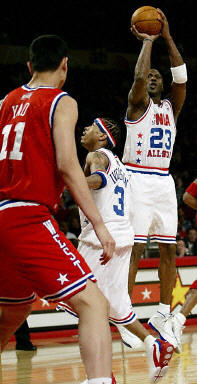 在本場(chǎng)比賽中,西部全明星隊(duì)的加內(nèi)特成為本方取勝的頭號(hào)功臣,他獨(dú)得全場(chǎng)最高分37分,另外,他有9個(gè)籃板5次搶斷和三次助攻。西部的后衛(wèi)科比-布萊恩特和弗朗西斯分別拿下了22分和20分,他們的助攻分別為7次和9次。得分超過(guò)兩位數(shù)的還有鄧肯和奧尼爾,他們都拿下了19分。中國(guó)球員姚明上場(chǎng)17分鐘,一投一中兩個(gè)籃板得到兩分。在東部聯(lián)盟中,艾弗森摘下35分,麥克格雷迪貢獻(xiàn)29分,喬丹20分5個(gè)籃板兩次助攻。這樣,喬丹在NBA全明星賽上的總得分已達(dá)到262分,打破了18次參加全明星賽的“天鉤”賈巴爾的251分的全明星賽總得分紀(jì)錄。