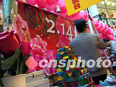 二月十日,北京一家商場搭起了一排粉紅色的柜臺,為即將到來的情人節(jié)商戰(zhàn)作準(zhǔn)備。作者:杜洋