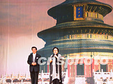 來自中國的老歌唱家十二日晚為一千名華盛頓華人華僑奉獻經(jīng)典老歌,受到熱烈歡迎。這是中國著名歌唱家王昆(右)在向觀眾介紹男高音歌唱家郭訟。作者:余東暉