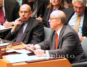 聯(lián)合國(guó)監(jiān)測(cè)、核查和視察委員會(huì)主席布利克斯(右)和國(guó)際原子能機(jī)構(gòu)總干事巴拉迪(左)二月十四日上午再次向聯(lián)合國(guó)安理會(huì)提交核查報(bào)告。(作者:趙海燕)