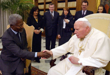 抵達羅馬參加聯(lián)合國發(fā)展署有關會議的聯(lián)合國秘書長安南與羅馬天主教皇約翰保羅二世舉行了長達30分鐘的會談。