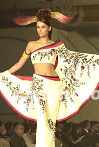 日本著名時(shí)裝設(shè)計(jì)師桂由美(Yumi Katsura)大膽采用和紙、竹工等日本傳統(tǒng)工藝,作出新穎的時(shí)裝,十八日在東京展示的和服借用了和紙剪繪的工藝技術(shù)。作者:陶光雄