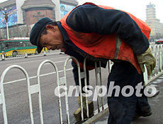 圖:北京環(huán)衛(wèi)工人清潔道路迎“兩會”
