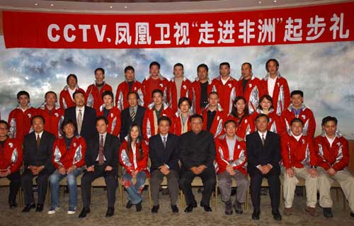 此次行動(dòng)由CCTV、鳳凰衛(wèi)視共同打造。雙方昨晚在北京釣魚臺(tái)芳菲苑舉行隆重的“起步禮”。外交部、國務(wù)院新聞辦、廣電總局、文化部等部門相關(guān)人士,以及非洲三十多個(gè)駐華使館的大使、文化參贊及各界約200余人到場為隊(duì)員們壯行。