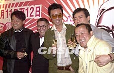 香港著名音樂人黃沾2月25日舉行《黃沾「獅子山下」演唱會》記者會,曾志偉、鄭少秋、鍾鎮(zhèn)濤、陳百祥(右起)上臺與黃沾祝酒。鄧慶樂 攝