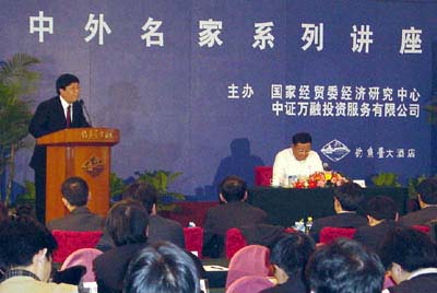 據(jù)了解,“中外名家系列講座”是由國(guó)家經(jīng)貿(mào)委經(jīng)濟(jì)研究中心和中證萬(wàn)融投資服務(wù)有限公司聯(lián)合主辦。自2001年9月起已舉辦了37期(每月2期),受到社會(huì)各界特別是企業(yè)界的廣泛好評(píng)。參加此期講座的嘉賓中,有來(lái)自企業(yè)界的知名人士及各大媒體領(lǐng)導(dǎo)。此期講座由專(zhuān)項(xiàng)部主任支東升主持。