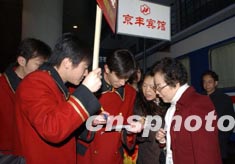 從二月二十七日早上開始,參加全國政協(xié)會議的委員陸續(xù)抵達(dá)北京。早上七時(shí)許,賓館工作人員在北京西站迎接來自湖北的政協(xié)委員。作者:張煒