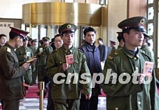 全國政協(xié)委員二十七日陸續(xù)抵京,北京人民大會堂安檢測試工作進(jìn)入最后階段。圖為解放軍工作人員手持兩會有效證件在大會堂內(nèi)進(jìn)行安檢測試。作者:廖文靜
