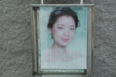 公園內(nèi)還有小憩之地,游人可以在這里邊休息邊聽鄧麗君的歌曲。小憩之地在廣場的旁邊,有石桌、石凳,是一個露天棚的形狀,上面是樹枝垂伏。這里最引人注意的是,石座中間有一副鄧麗君的照片,是少女時代的模樣,這樣的安排,仿佛鄧麗君就坐在你身邊,和你坐在一起談心。照片是彩色的,鄧麗君青春煥發(fā),光彩奪人。照片裝在一個鏡框中,周圍有點發(fā)黑和發(fā)黃,似乎有些陳舊,可能已經(jīng)保存相當長的時間了。