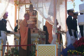 今天早上,泰國曼谷空軍機(jī)場舉行了隆重的送歸儀式。泰國文化部長烏萊婉致詞,她以泰國政府、佛教界和全國人民的名義,衷心感謝中國政府為慶祝泰國國王陛下75圣壽大吉,同意佛牙舍利自2002年12月15日至2003年2月28日共76天,赴泰佛統(tǒng)府佛教城臨時(shí)供奉76天。她說,供奉期間,泰國人民前往佛教城舉行各種各樣的參拜活動(dòng)。泰國王儲殿下于1月9日代表國王陛下前往參拜,泰國佛教最高領(lǐng)袖僧王兩次參拜,泰國樞密院主席、國會主席、上議院主席、內(nèi)閣主要領(lǐng)導(dǎo)人以及眾多議員都前往參拜。在佛牙舍利臨時(shí)赴泰供奉事宜圓滿成功之際,泰國政府對中國政府和人民以及中國佛教協(xié)會表示衷心的感謝,并祝愿泰中友好萬古長青。