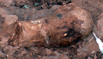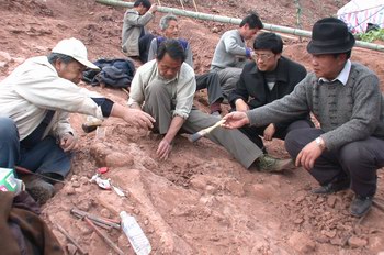 中新網(wǎng)3月2日電 曾經(jīng)出土過許多恐龍蛋化石、骨化石的浙江省天臺(tái)縣,最近邀請有“龍王”美譽(yù)的中國科學(xué)院古脊椎古人類研究所著名恐龍專家董枝明教授、中國地質(zhì)科學(xué)院資源所礦物巖石學(xué)家陳克樵教授首次對恐龍骨化石進(jìn)行科學(xué)的搶救性挖掘。經(jīng)過近一周的工作,已發(fā)現(xiàn)了恐龍脊柱骨、肋骨、尾脊、小的甲片、前后肢等化石。
