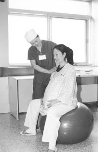 她感覺最有意思的鎮(zhèn)痛措施是:在兩次陣痛之間騎坐在分娩球椅上。分娩球是一個(gè)直徑1米的彩色充氣橡膠球,固定在有扶手的坐椅上,在規(guī)律宮縮的間歇騎坐上去,可以達(dá)到放松盆底肌肉的目的。她坐了一會(huì)兒,果然感到柔軟舒適,疼痛減輕!