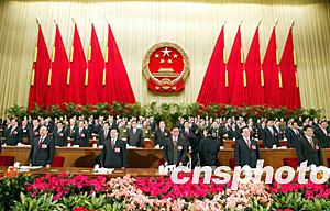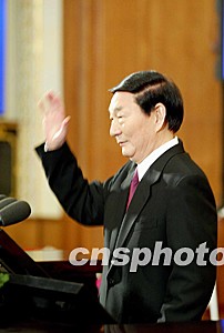 在與會五千多名人大代表、政協(xié)委員的持久掌聲中,江澤民、胡錦濤、李鵬、朱镕基、李瑞環(huán)、李嵐清、吳邦國、溫家寶、賈慶林、曾慶紅、黃菊、吳官正、李長春、羅干等中國領導人微笑著步入會場。