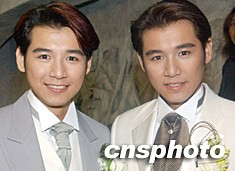 來自臺灣的組合TOPTWINZ(陳騰龍、陳躍虎兄弟)三月四日在香港“現(xiàn)代經(jīng)典”影樓與香港藝員朱茵一起拍攝主題為“花團錦簇”的婚紗晚裝作品。錢興強 攝