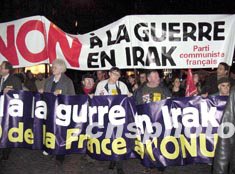 法國(guó)巴黎五日再度舉行反戰(zhàn)示威游行。數(shù)以千計(jì)的青年學(xué)生、左派人士走上街頭,高呼“要和平,不要戰(zhàn)爭(zhēng)”的口號(hào),反對(duì)美國(guó)出兵攻打伊拉克。圖為由法共組織的游行隊(duì)伍在夜色中行進(jìn)。作者:蔚中