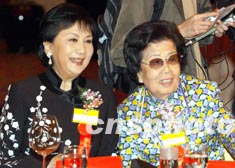香港電影界著名前輩夏夢(mèng)(左)三月六日晚盛裝出席此間舉行的慶祝國(guó)際婦女節(jié)活動(dòng),圖為夏夢(mèng)與孔愛(ài)菊談笑甚歡。潘索菲 攝