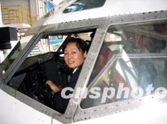 中國海南航空公司第一位女機(jī)長丁華榮駕駛飛機(jī)準(zhǔn)備升空。作者:黃葵