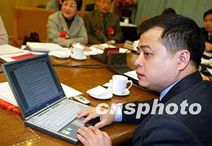 全國人大代表、浙江正泰集團(tuán)公司董事長(zhǎng)南存輝,七日在浙江代表團(tuán)審議會(huì)上使用電腦修改發(fā)言稿。在今年的人代會(huì)上,很多代表都是攜帶電腦參會(huì)。作者:毛建軍