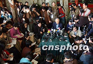 準三點鐘,吳敬璉教授來到現(xiàn)場,身穿西服,不系領帶,頭發(fā)紋絲不亂。他從記者群中擠了進去,面對不停閃光的鏡頭,他神閑氣定,極其認真地回答著記者們提出的每一個問題。