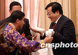 全場穿得最“靚”的青海省海南藏族自治州州長公保尚,說著說著便拿出“哈達(dá)”獻(xiàn)給曾慶紅,表達(dá)對黨中央的謝意。曾慶紅笑著站起來,連迎兩步,雙手接過,連聲說“謝謝!”