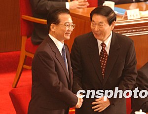 中新社北京三月十六日電本社記者張朔在人民大會堂現(xiàn)場報道:根據(jù)國家主席的提名,今天在這里舉行的十屆全國人大一次會議第六次會議決定,中共中央政治局常委溫家寶為中國新一屆國務(wù)院總理。