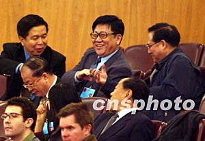 三月十七日,十屆全國人大一次會議舉行第七次全體會議,正在會場的新任部長們互致祝賀。作者:張煒