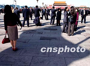 三月十七日北京天安門(mén)廣場(chǎng)春光明媚,人大代表們?cè)趨⒓尤珖?guó)人大十屆一次會(huì)議第七次全體會(huì)議投票前紛紛拍照留影。作者:賈國(guó)榮