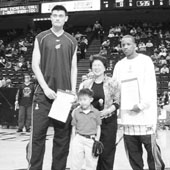 在14日晚火箭隊(duì)與公牛隊(duì)開(kāi)賽之前,黃朱惠愛(ài)女士帶著她那也是“姚明小球迷”的孫子一道走向了姚明。她代表德州州長(zhǎng)培瑞和州政府及州議會(huì)向他頒發(fā)了祝賀狀,姚明十分高興地從這位當(dāng)?shù)刂娜A裔女議員手中接過(guò)了祝賀狀。